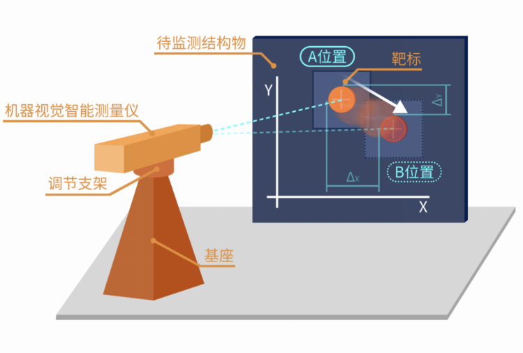 基于機器視覺的表面位移智能測量,進行監(jiān)測時,在待測結(jié)構(gòu)物上布設(shè)若干靶標,在相對結(jié)構(gòu)物穩(wěn)定的位置安裝機器視覺智能測量儀,機器視覺智能測量儀識別結(jié)構(gòu)物上的靶標圖像,當被測結(jié)構(gòu)物發(fā)生平面位移時,靶標坐標隨之變化,從而測量到被測物的水平與垂直雙向位移。